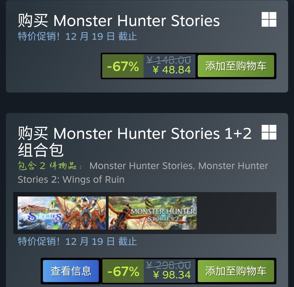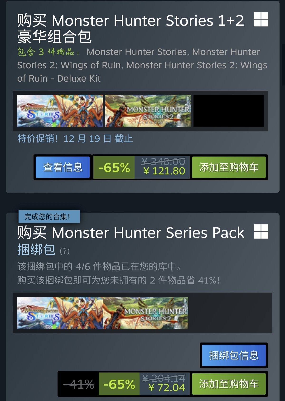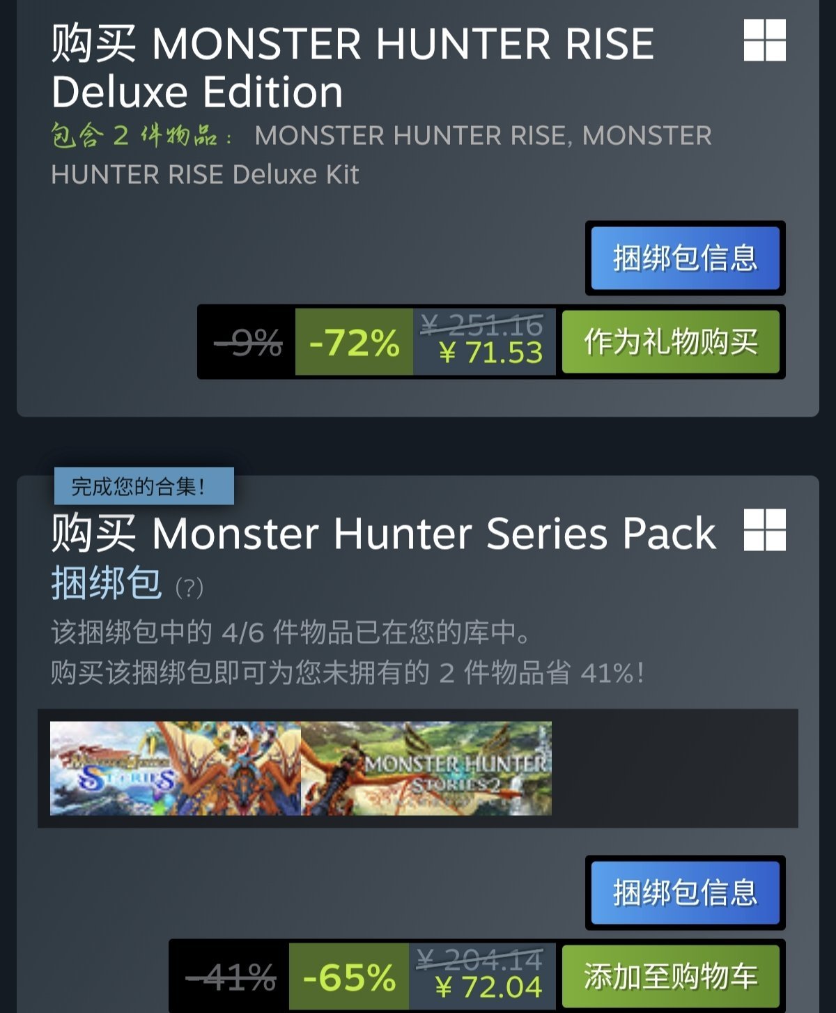 两部游戏,第一个都是对应本体,第二个是1+2两部游戏本体包,有1+2本体,第三个是1+2两部游戏豪华版包,在第二个基础上面加了皮肤,第四个怪物猎人大包,世界+冰原,崛起+曙光,物语1+2普通版。