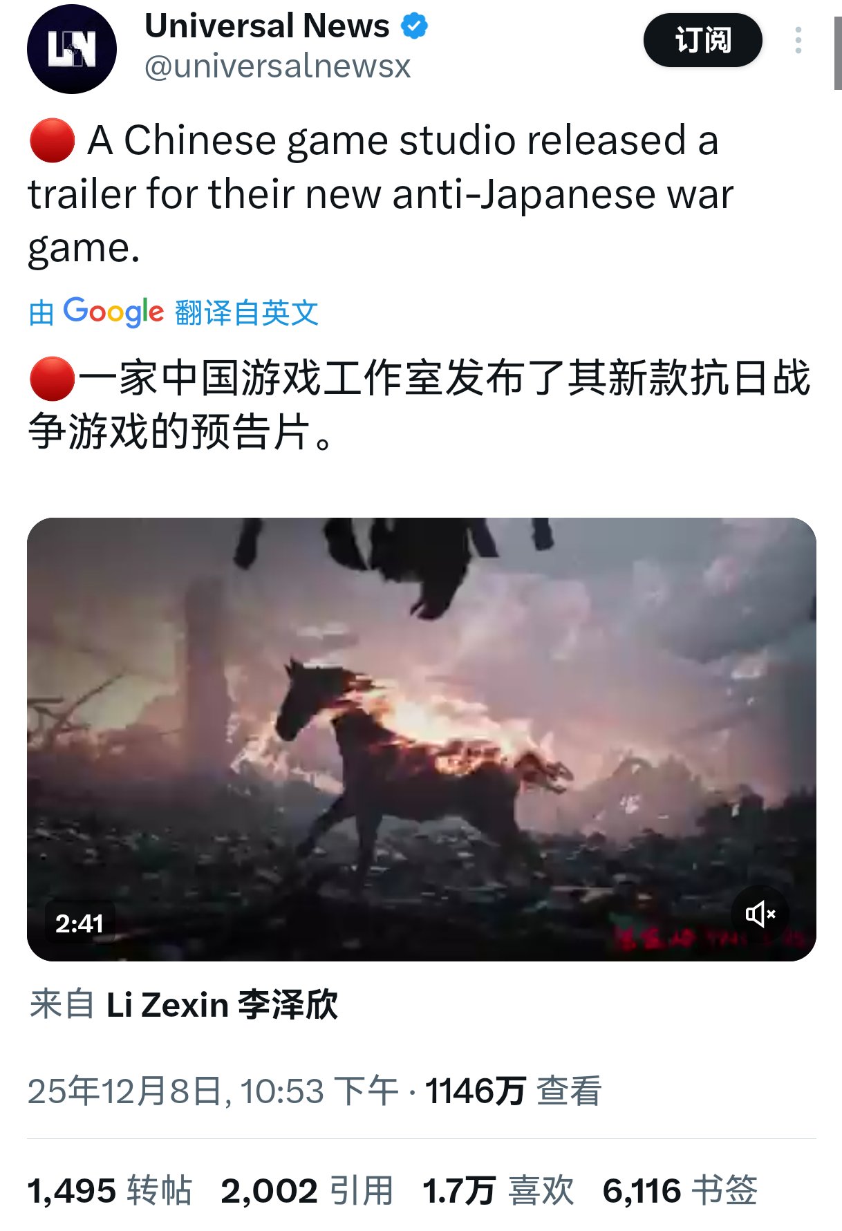 抗日游戏预告片放出后收获1146万观看以及1.7万喜欢