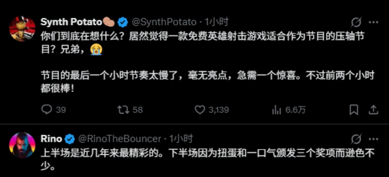 這一結果反映了大量觀衆對本次頒獎典禮的安排不滿。知名遊戲博主Synth Potato與Rino在評論區指出,典禮最後一小時節奏嚴重失衡,壓軸項目選擇不當,缺乏令人興奮的高光時刻,迫切需要一個真正的最終驚喜。有評論認爲,儘管典禮前半段表現可圈可點,但後半段的安排拉低了整體體驗。TGA的評選機制本身也存在爭議,玩家投票權重僅佔10%,媒體投票佔90%,這一設計常被質疑弱化了玩家聲音。儘管官方解釋這是爲防止刷票,但許多玩家認爲現行制度仍不夠公平透明。