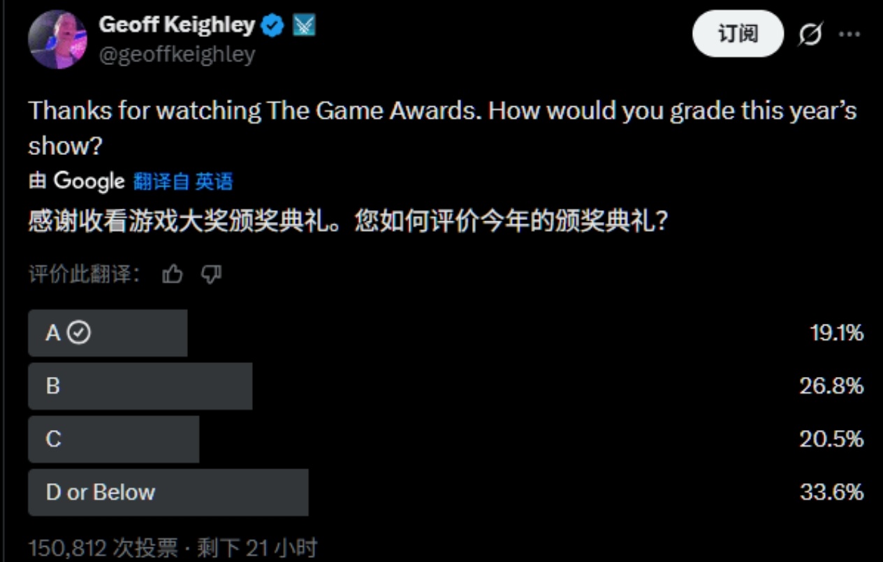 TGA 2025頒獎典禮於12月12日落幕,儘管《光與影:33號遠征隊》斬獲年度最佳遊戲等九項大獎,但頒獎典禮後創始人傑夫·基斯利在社交平臺X上發起的觀衆評分投票卻遭遇差評潮。截至發稿,超過18萬玩家參與投票,其中給出“D級及以下”最低評價的觀衆比例高達33.6%,而給予最高“A”評價的僅佔19.1%。
