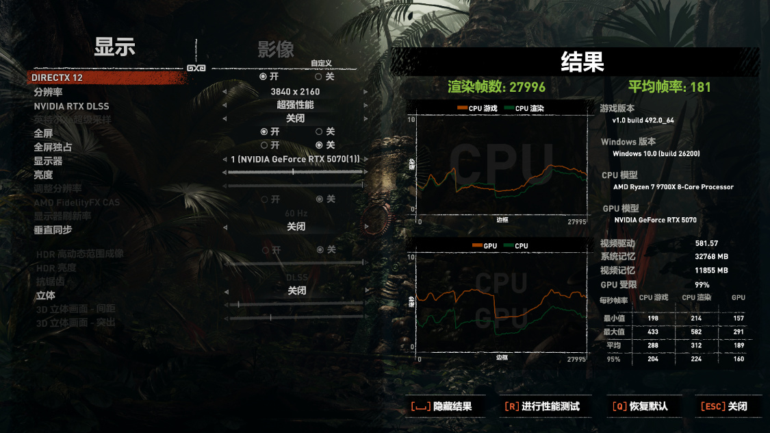 《古墓丽影·暗影》基准测试,画质最高,光追超高,4K分辨率,DLSS超强性能,游戏平均帧率为181 FPS。DLSS质量模式,游戏平均帧率为102 FPS。2K分辨率下,DLSS超强性能,游戏平均帧率为243 FPS。DLSS质量模式,游戏平均帧率为174 FPS;