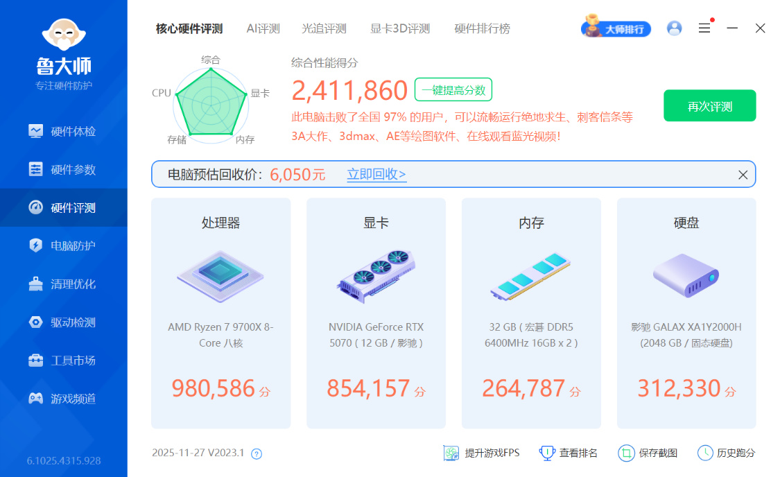 鲁大师跑分241.1W分;