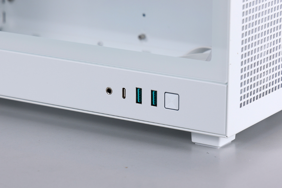机箱I/O面板位于机箱左侧底部,提供1个带灯环的方形开机按钮、2个USB 3.0、1个USB 3.2 Gen2 Type-C数据接口以及1个3.5mm音频口。而在I/O面板的尾部还设计了一块九州风神的图形LOGO作为点缀,增强机箱辨识度。