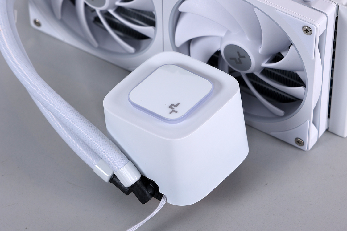 冷头方面,水冷采用ARGB果冻灯效系统,整个冷头均采用了白色半透光材质的外壳,可以将隐藏在冷头内部的ARGB灯珠,展现出十分均匀柔和,类似果冻一样的冷头灯效。冷头顶部还有一块支持四向调节LOGO盖板,盖板通过卡扣的方式固定在冷头上。
