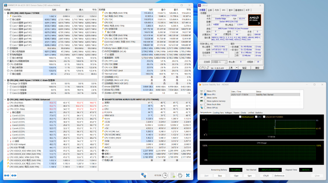 室温27°,机箱内环境,单烤FPU基准测试,CPU外壳温度95°左右,CPU封装功耗150W左右。