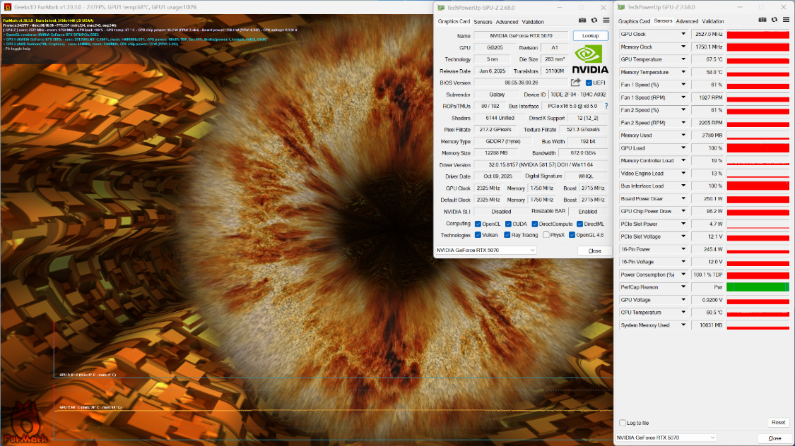 FurMark烤机测试,烤机15 Min+,显卡温度68°左右,显卡功耗为250W左右;