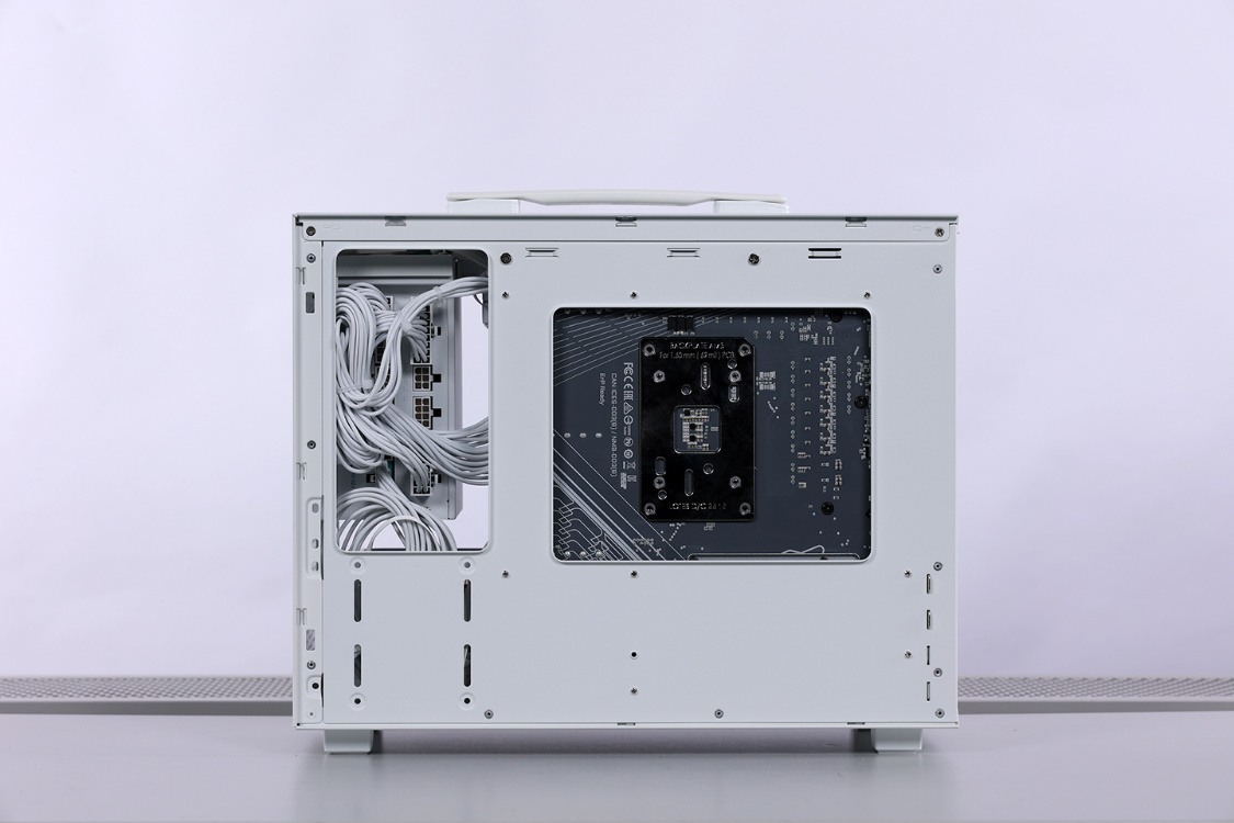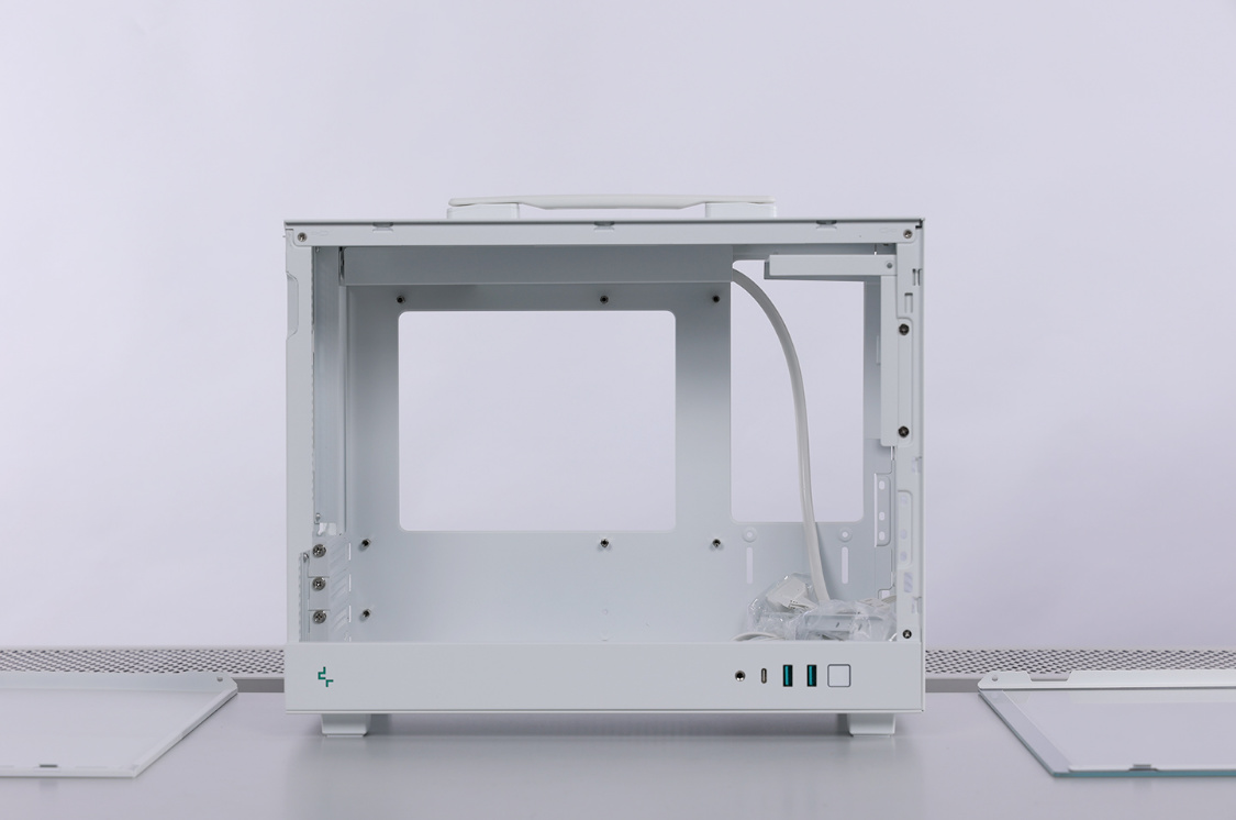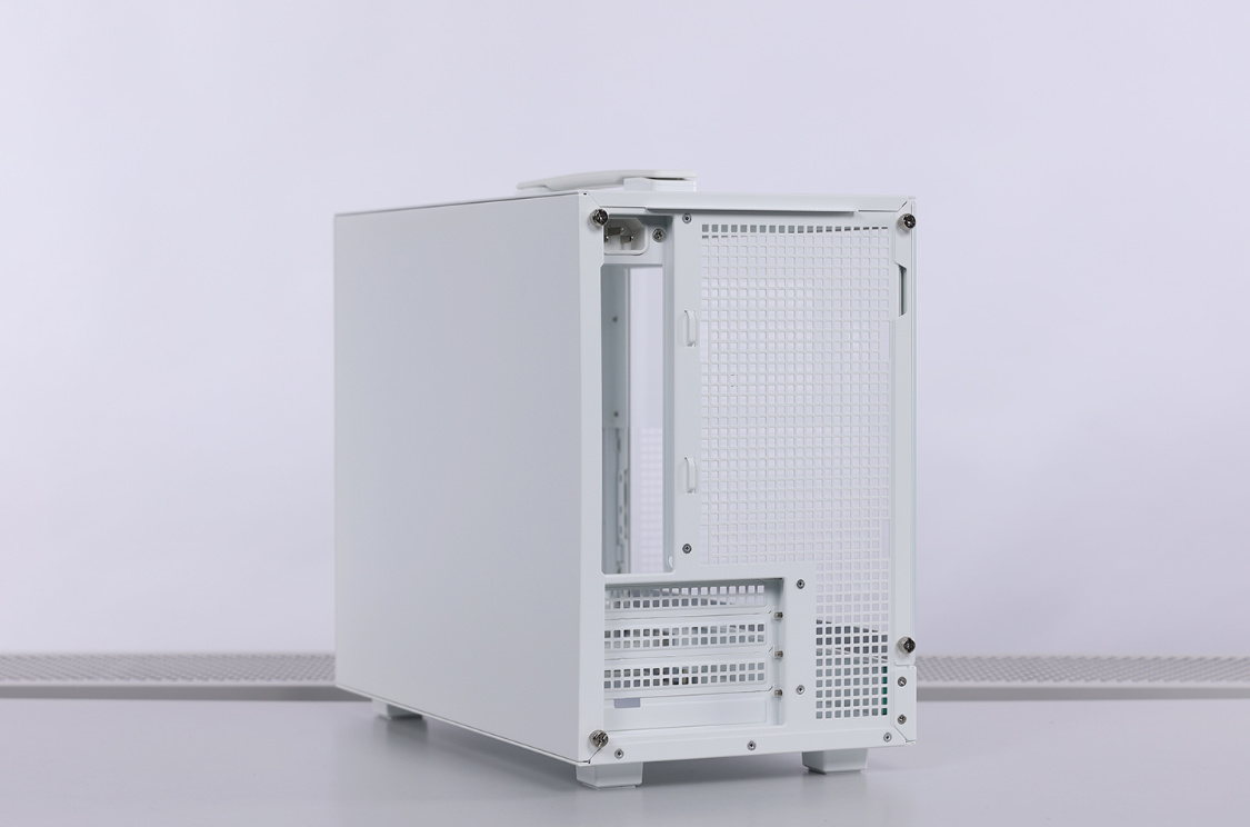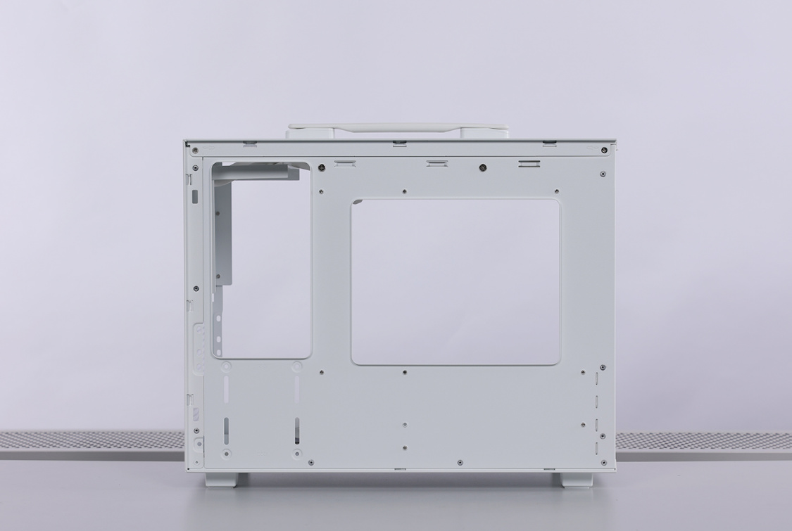 机箱侧板均使用手拧螺丝固定,拆装方便。兼容性方面,机箱采用电源位前置的设计,最大支持安装长度不超过140mm的常规ATX规格电源,也支持安装SFX规格的的电源,机箱支持安装MATX/ITX规格主板,支持安装长度在342mm以内的显卡(安装前置拓展框架,降低至328)。支持顶置240冷排,风冷限高164mm。整个机箱在安装前置拓展框架后,最多可同时安装4把120mm规格散热风扇。当安装SFX规格电源时,前置拓展支架则支持安装140mm规格散热风扇。前面板风扇位,也可以用于安装3.5寸/2.5寸硬盘。此外,机箱背面电源仓下方也预留了2个2.5寸SATA固盘安装位。