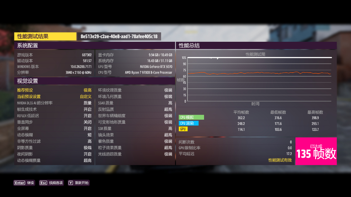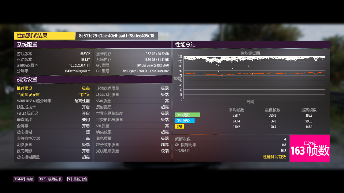 《极限竞速·地平线5》测试,4K分辨率下,极端画质,极端光追,开启DLSS 3.0并设为超高性能模式,游戏平均帧数163 FPS,DLSS为质量模式时,游戏平均帧数135 FPS;