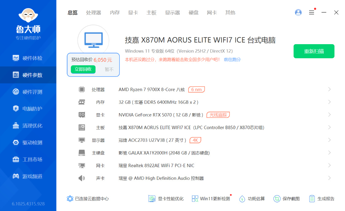 完整配置:AMD R7-9700X处理器、技嘉X870M AORUS ELITE WIFI7 ICE主板、影驰RTX 5070星曜LUNA OC显卡、宏碁掠夺者Hera影锋D5-6400MT/s C30冰戟银16G*2内存、影驰星曜7000 Plus 2T M.2固态硬盘、九州风神CH160 Plus WH机箱、九州风神冰果240Pro白色一体式水冷、九州风神 猿宇宙Pr750G白色金牌全模组电源、影驰魅影风扇*1...别问,问就是一万三。当然,仅供参考。至于性价比,也建议暂时先将脑子寄存一下,因为实在看不到。