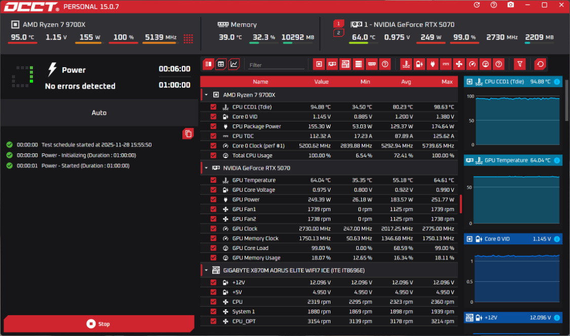 OCCT双烤,显卡/处理器满载,运行也相当稳定。