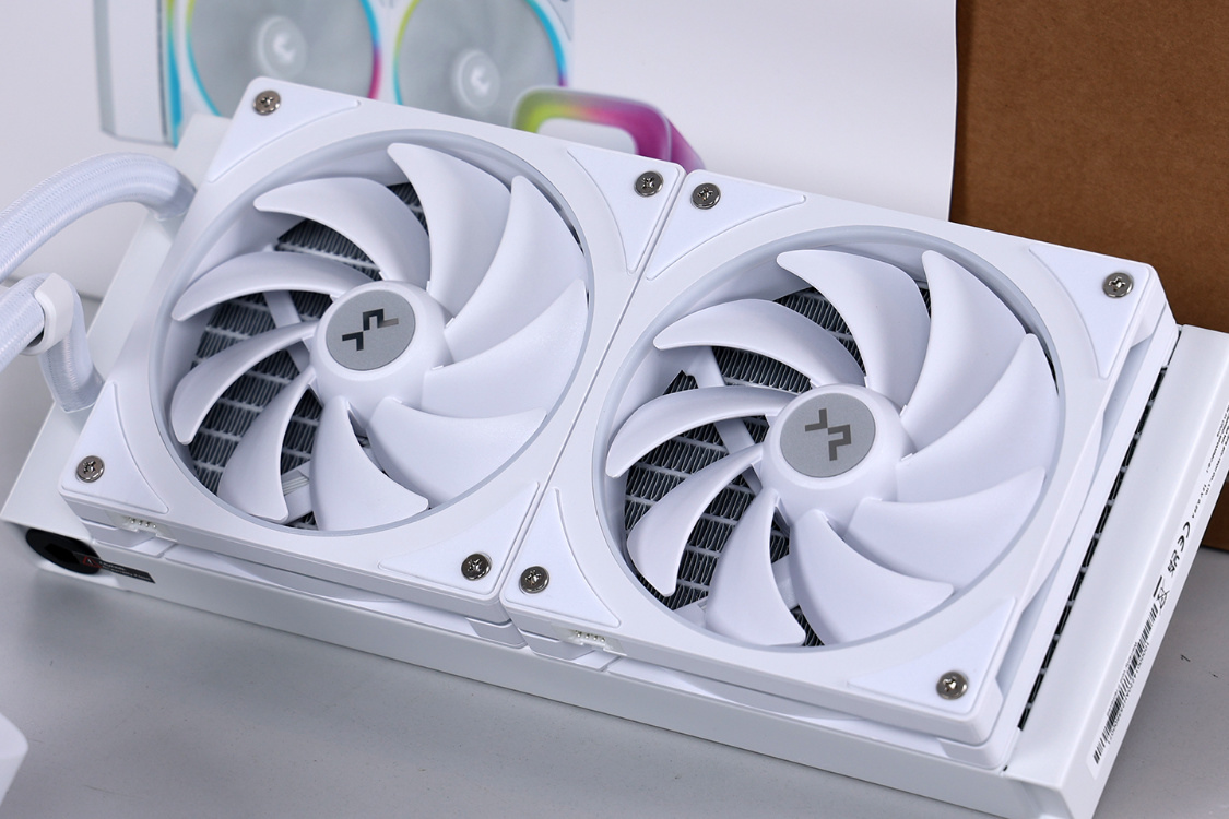 水冷预装好了2把白色120mm规格ARGB风扇,风扇之间采用一线通设计。两把风扇均采用转速可达2400RPM±10%的高转速马达和耐磨液压轴承,搭配上9片流线型扇叶,最高可提供66.23CFM的风量和3.27mmAq的风压,而得益于液压轴承和风扇四角处质地柔软的橡胶脚垫,风扇满载时的运行噪音仅为36.07分贝。