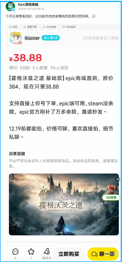 圣诞季临近,Epic 游戏商城的 “神秘游戏连送” 活动刚拉开序幕,就闹出了让人啼笑皆非的插曲。某二手平台平台上,本该免费领取的开放世界大作《霍格沃茨之遗》,被商家包装成 “超低价代购” 公然售卖,38.88 元的标价和 384 元的原价对比,吸引了不少不知情玩家。