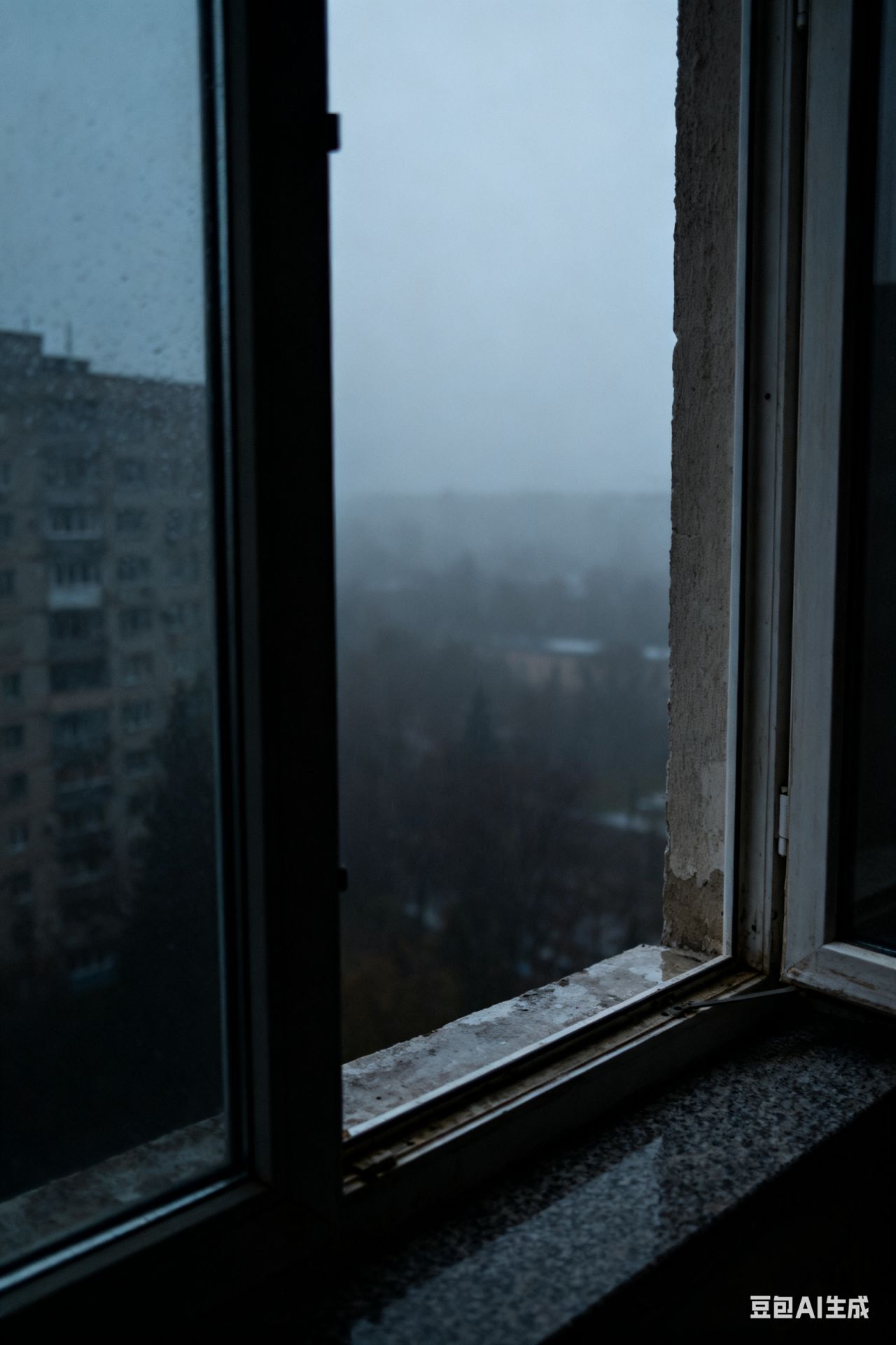 帮我生成图片:这是一张具有写实写真风格的图片,画面质感十足,采用自然光线和质感光照的摄影风格。以第一视角镜头呈现,视角是站在楼房开着的窗子边,窗外天气阴暗,整个画面营造出一种独特的氛围,窗外的景物在阴暗的光线下显得有些朦胧,而窗边的细节则清晰展现出其真实的质感。图片风格为写真,比例 2:3。