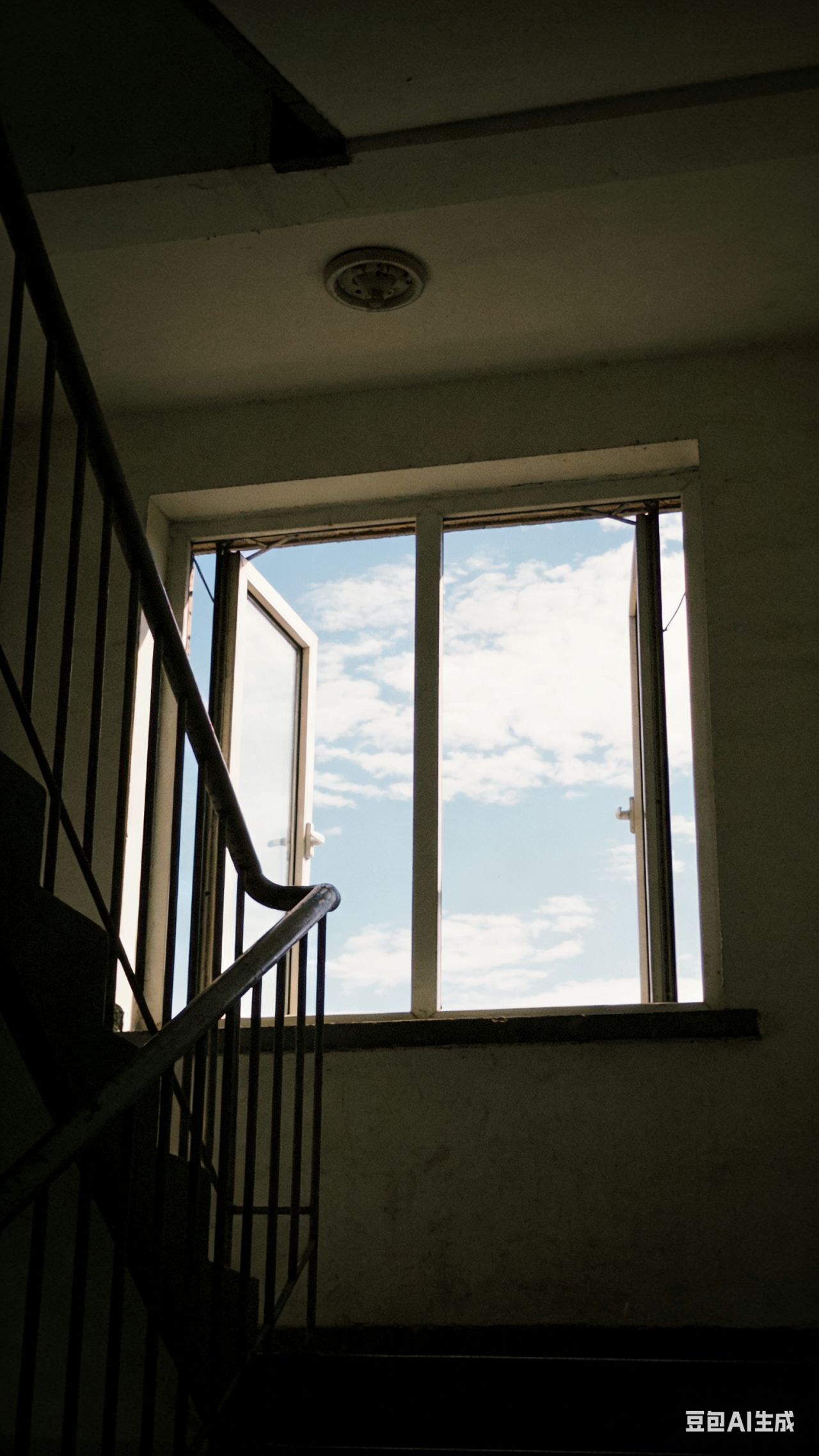 运用写真的手法并结合千禧年的风格,画面里是一个寂静的熟悉楼梯间,没有任何人的踪影,昏暗的光线使得楼梯间弥漫着一丝孤独与怀旧的气息。楼梯间的窗户朝着外面那片晴朗的天空敞开着,天空中飘着几朵洁白的云彩,画面以中景构图为主,重点突出楼梯间与窗外晴朗天空的对比,给人以视觉上的冲击。