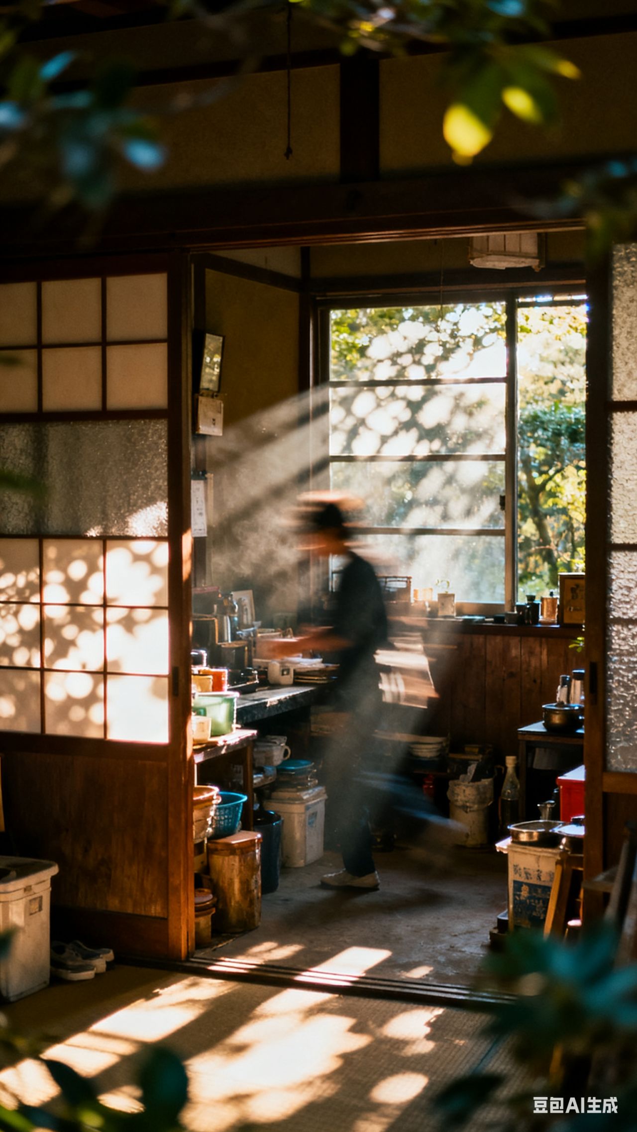 帮我生成图片:以胶片摄影的视觉风格,画面聚焦于日本的一处室内场景。阳光透过窗户,在屋内形成斑驳的光斑,倾泻而下,营造出迷离的氛围。室内的物品摆放错落有致,人物在其中活动,产生拖影的效果,与周围环境融合模糊,采用非常规独特的构图,展现出朦胧诗意的画面,极致的光影美学通过色彩的叙事来表达情绪,充满了电影质感。比例 9:16。