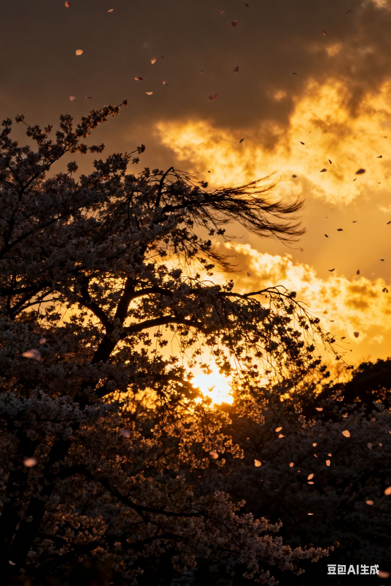 帮我生成图片:呈现出具有故事感的电影写真风格画面,夕阳西下的时刻,昏暗的天空中金色的朝霞肆意铺展,像是大自然绘就的绝美画卷。樱花树的枝条随风舞动,花瓣被风吹得四处飘散。画面的光影处理巧妙,夕阳的余晖洒在樱花树上,形成明暗对比,营造出一种自由随性又浪漫至极的氛围。比例 2:3。