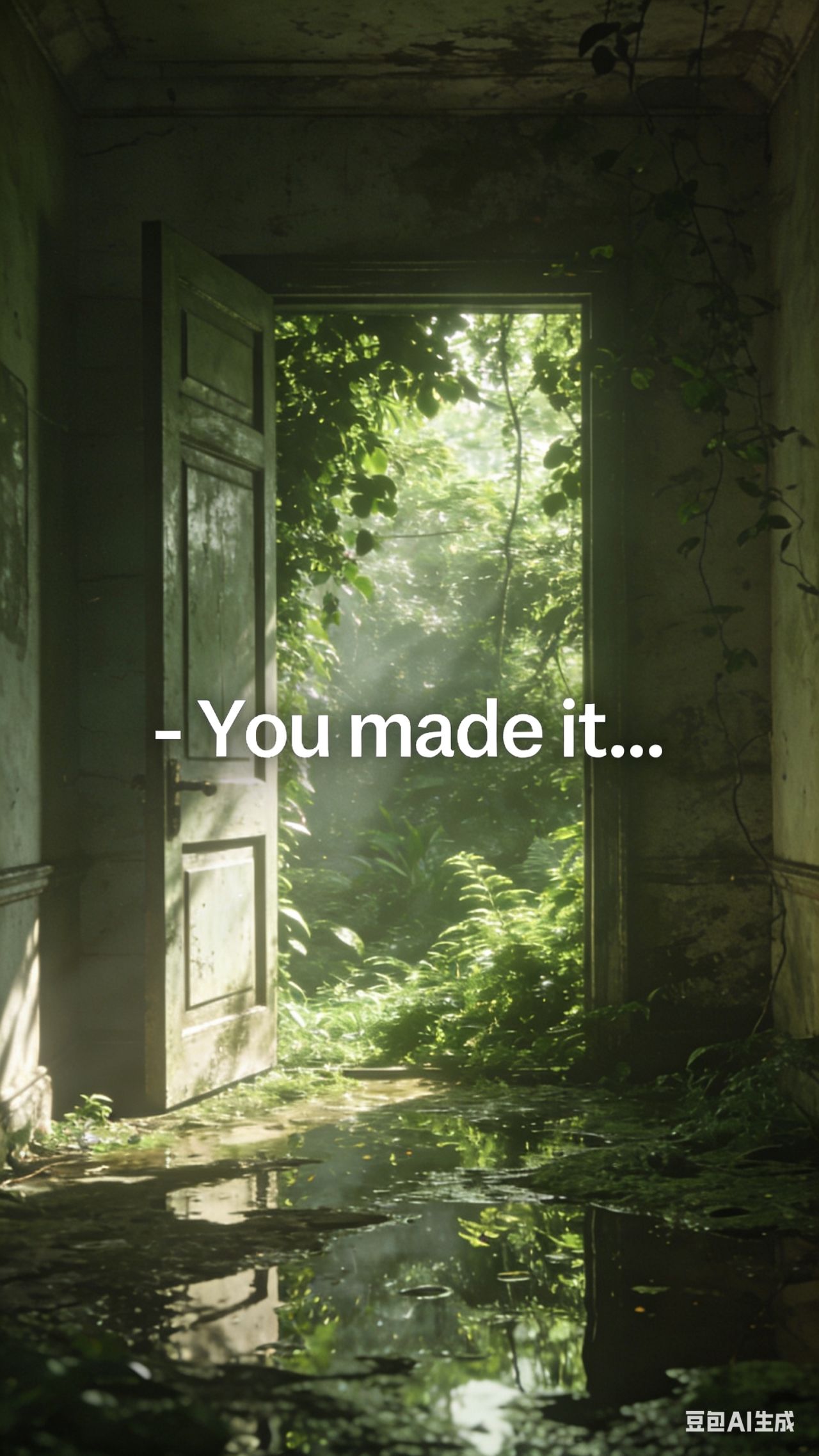 帮我生成图片:超现实风格的室内画面,结合写真风的摄影特点,利用自然光线和质感光照突出画面质感。室内的门、翠绿的绿植以及地面上大片的水洼构成了主要的场景元素,整个空间弥漫着梦幻与宁静的气息。在画面中合适的地方有着艺术字“- You made it…”,与场景完美结合,展现出独特的艺术魅力。比例 9:16。