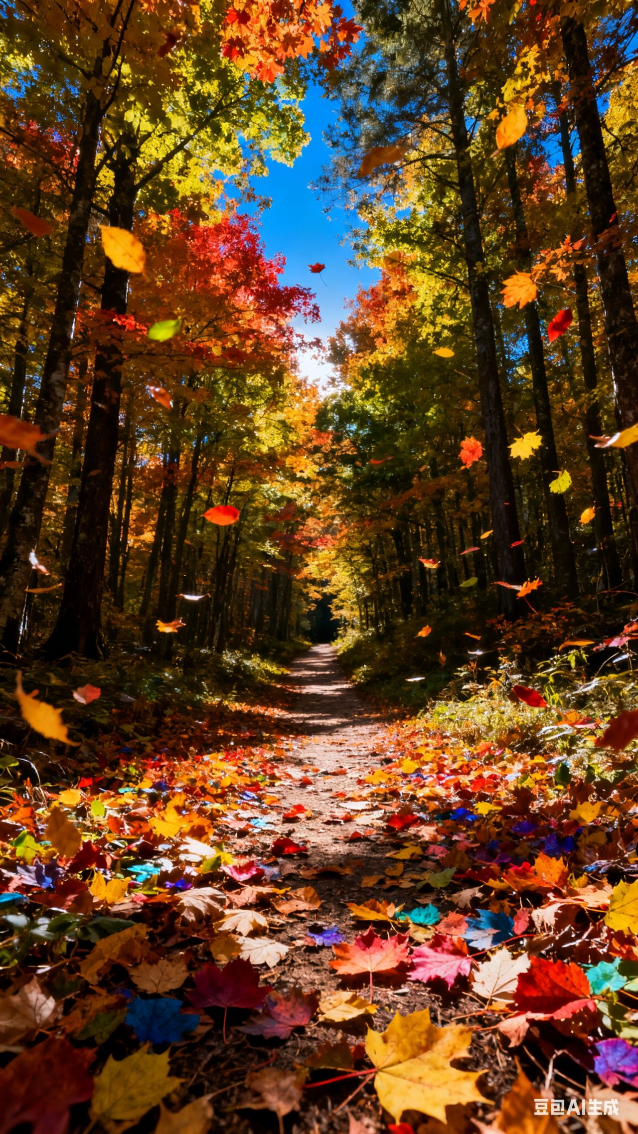 帮我生成图片:写实摄影风格,秋天的森林里,五彩斑斓的树叶纷纷飘落,地上像是铺上了一层彩色的地毯,中间有一条幽静的小径通向远方,透过树林的缝隙可以看到湛蓝的天空,顶光使画面光影对比强烈,色彩鲜艳。比例 9:16。