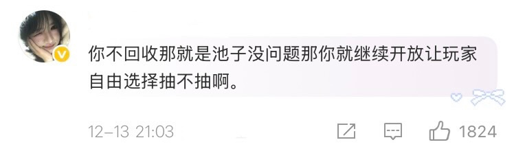 但是玩家们对不回收不回档依旧不买账,确实是前期策划测试不够导致的漏洞,但也不能直接回收,因为对于已经抽到的人来说这就构成欺诈了,所以法律风险极大。