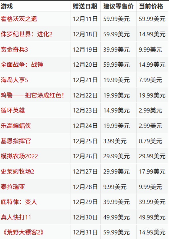 截图显示:其它免费赠送游戏包括《侏罗纪世界:进化2》《赏金奇兵3》《海岛大亨5》《循环英雄》《小鸡警员》《乐高蝙蝠侠》《指挥官基恩》《泰拉瑞亚》《底特律变人》《真人快打11》《史莱姆牧场2》《模拟农场2022》《全面战争:战锤》《荒野大镖客救赎2》。