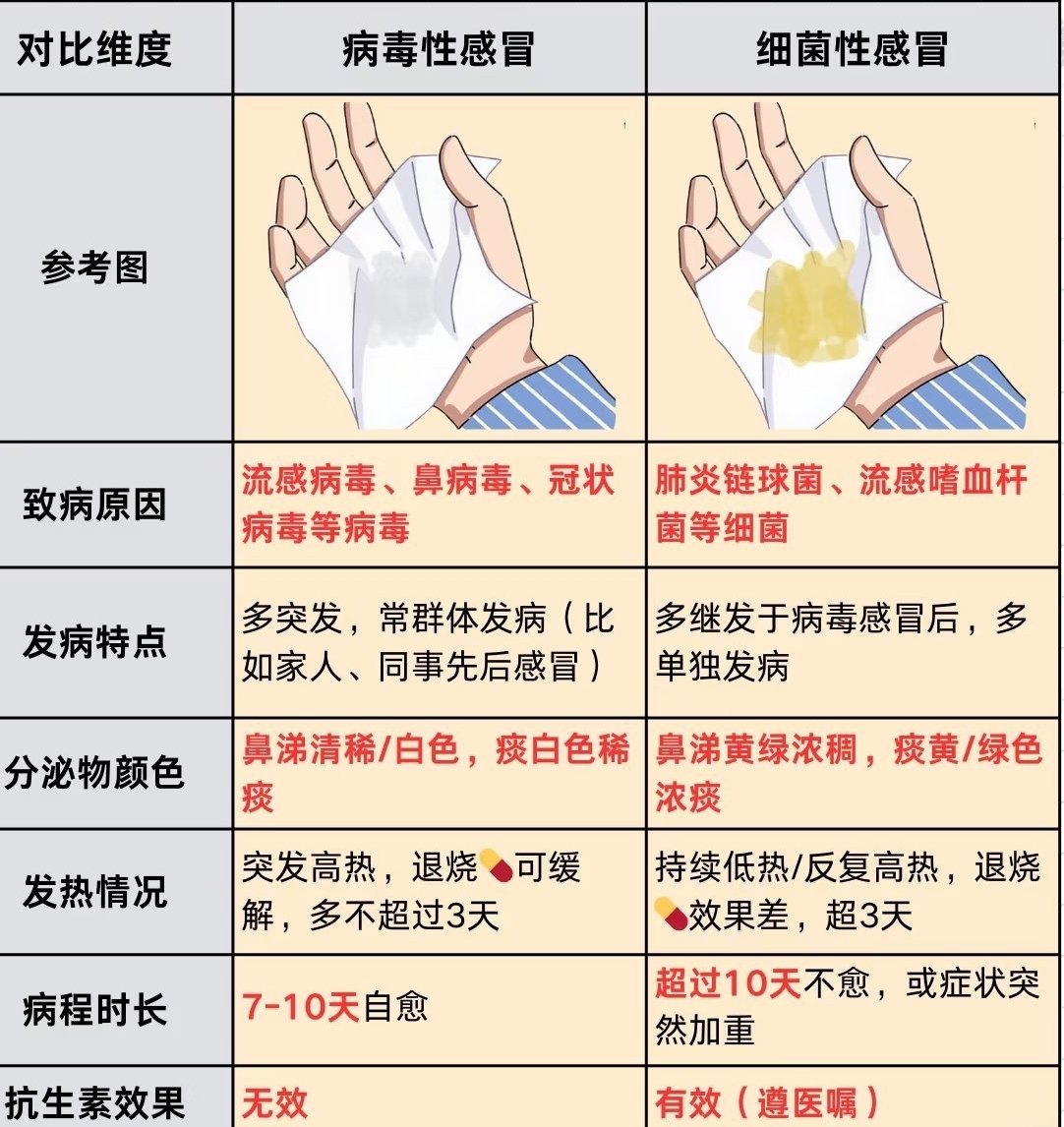 呼吸道症状严重(咳嗽,脓痰,脓涕—无论黄绿),但没有全身酸痛,低热为主,或反复中高热,多为细菌性