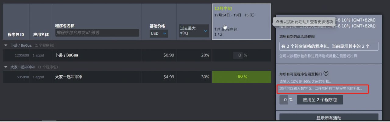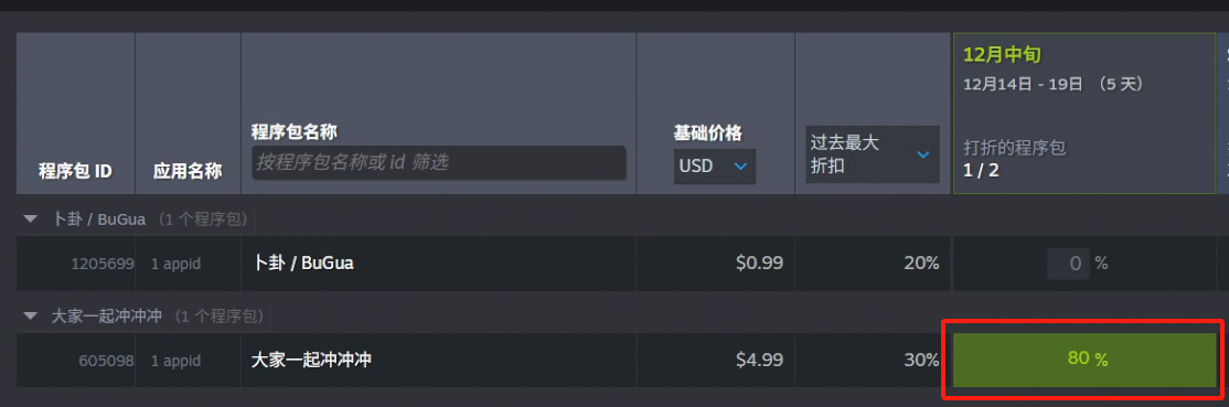 早上起来一看,好家伙,咋是2折呢?然后我们去Steam后台一看。傻眼了,折扣是80%,就是2折。
