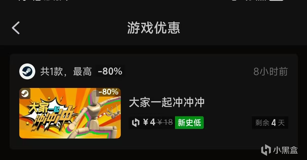 事情是这样的,一大早打开小黑盒收到了这么一个提示,就是我们去年的一款爆笑多人闯关游戏《大家一起冲冲冲》的折扣提示。一下子就给我干清醒了!