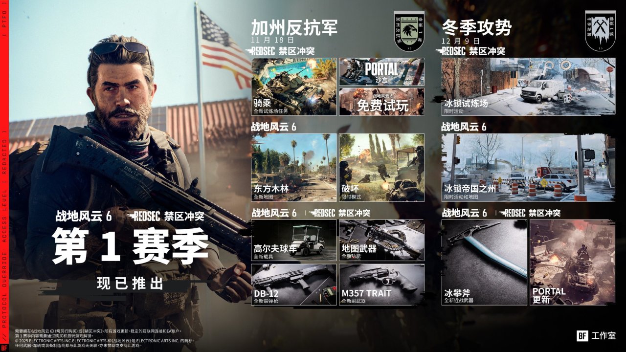 首先是第一赛季预告,两部大更新,11月18号的加州反抗军,以及12月9号的冬季攻势。都是大玩法更新,平均下来一个月一次大玩法更新,速度还是相当之快的。