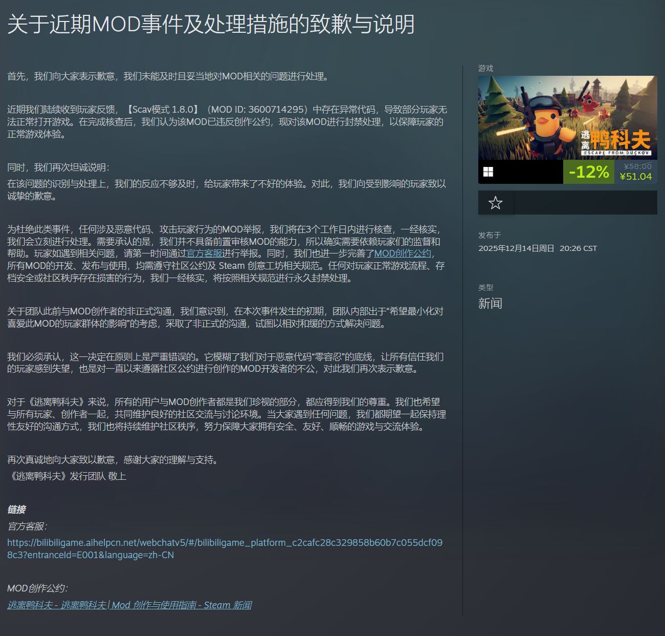 開發團隊承認在處理該問題上反應不夠及時,給玩家帶來了不好的體驗,官方已將Scav MOD進行封禁處理,保障玩家的正常遊戲體驗。