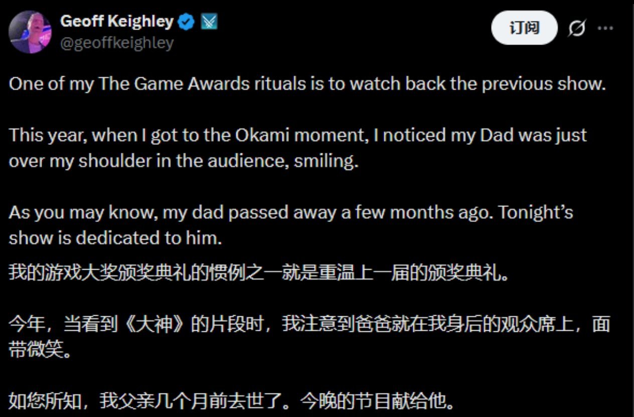 TGA主辦人Geoff Keighley在頒獎典禮前宣佈,將本屆盛獻給幾個月前去世的父親David Keighley。傑夫表示,他每年籌備TGA前都會回看上一屆典禮。在去年《大神》相關片段中,他於觀衆席背景裏看到了正在微笑的父親,這使他思緒萬千。