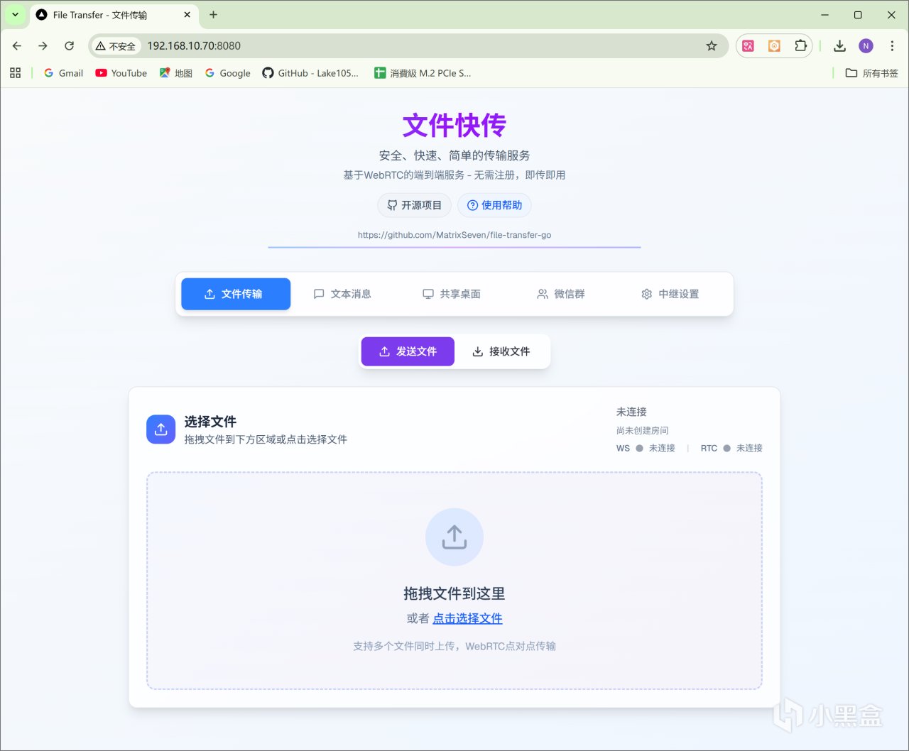 使用它的方式非常簡單,部署該項目後,訪問前端網頁,就能一目瞭然的看到文件傳輸、文字傳輸和桌面共享3個功能。
