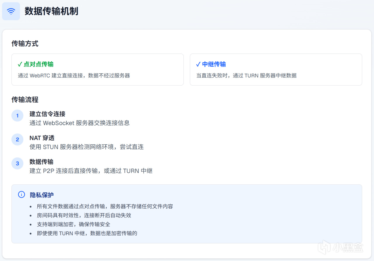 同時,這款軟件的安全和私密性也非常棒,它底層使用了WebRTC傳輸方式,實現了端到端的數據加密,文件發送方與接收方之間是P2P點對點直連,無需中轉。而中間服務器只起到了牽線搭橋的作用,並不會參與文件傳輸過程。