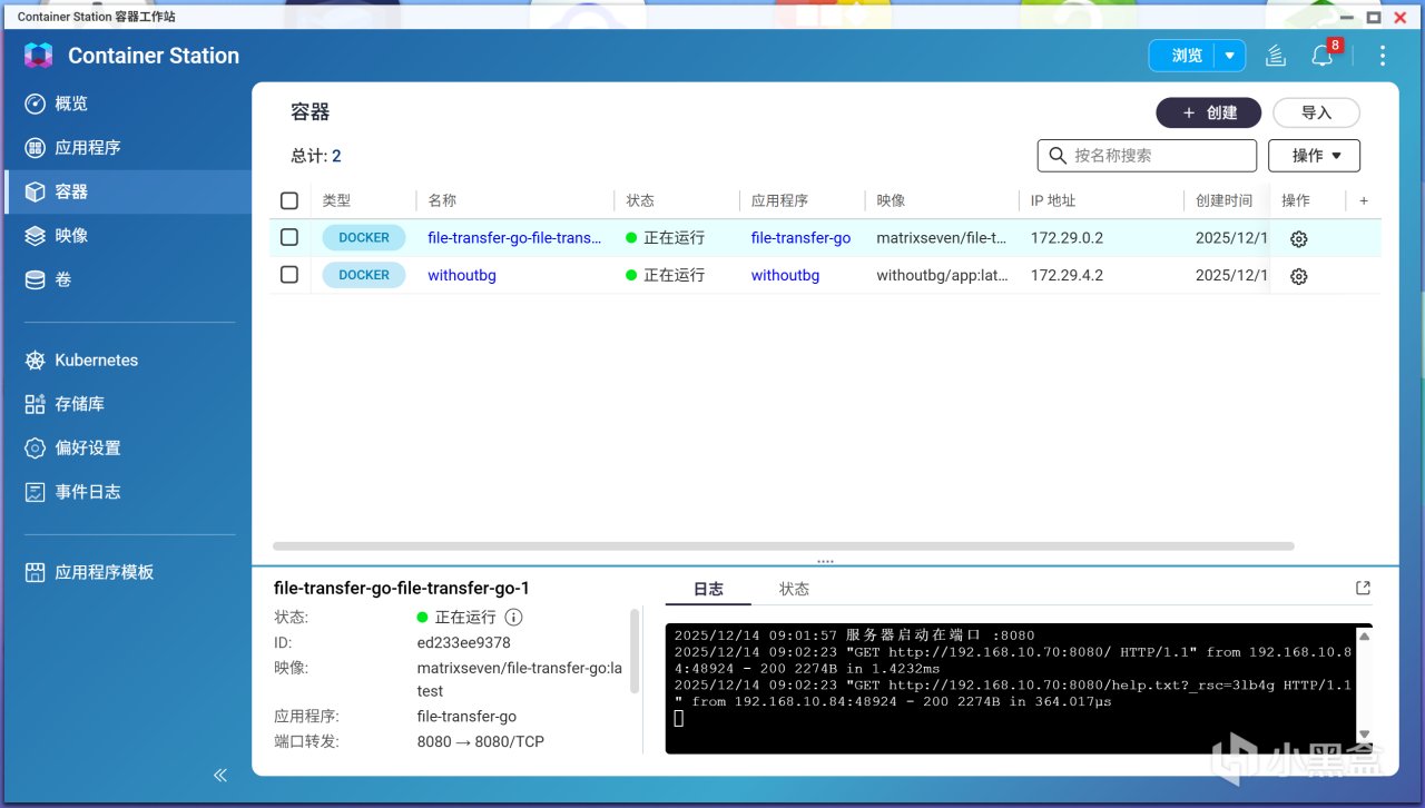 威聯通NAS在拉取docker鏡像後會自動運行容器,此時在Container Station中可以看到: