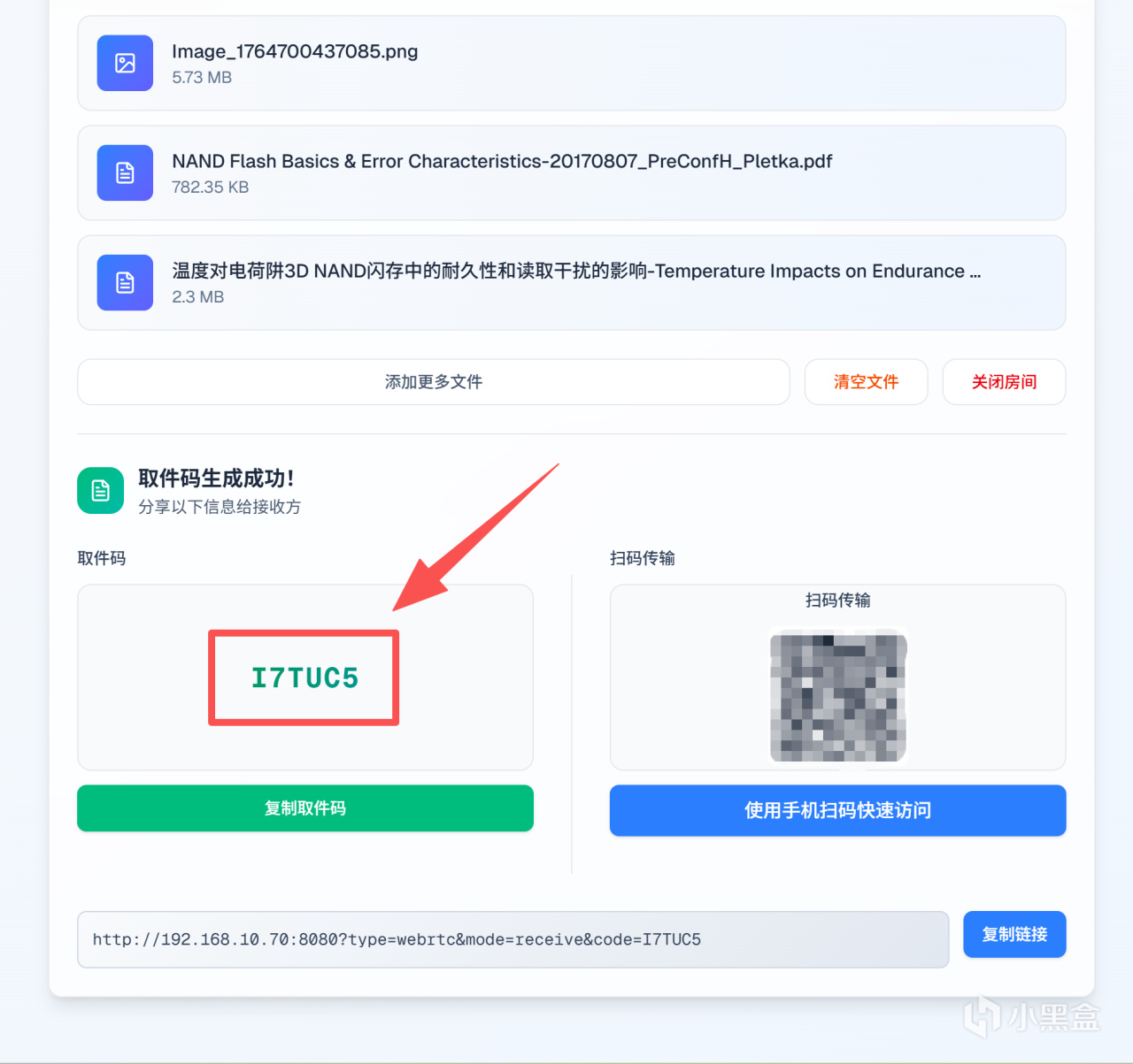 比如想要傳輸文件時,文件發送方在網頁端同時選擇需要的文件後,點擊“生成取件碼”,然後就可以生成6位隨機字符: