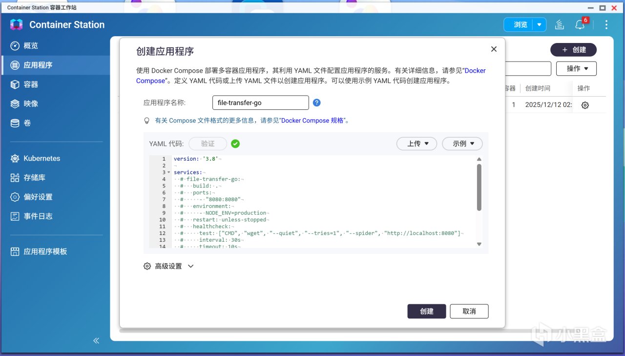 爲了方便,我們使用docker compose方式直接部署,打開威聯通Container Station,點擊左側的”應用程序“,然後點擊右側黑色”創建“按鈕,輸入以下代碼: