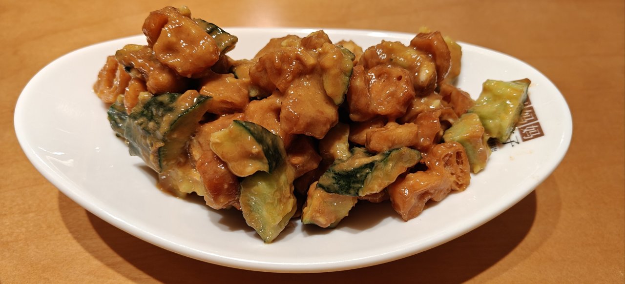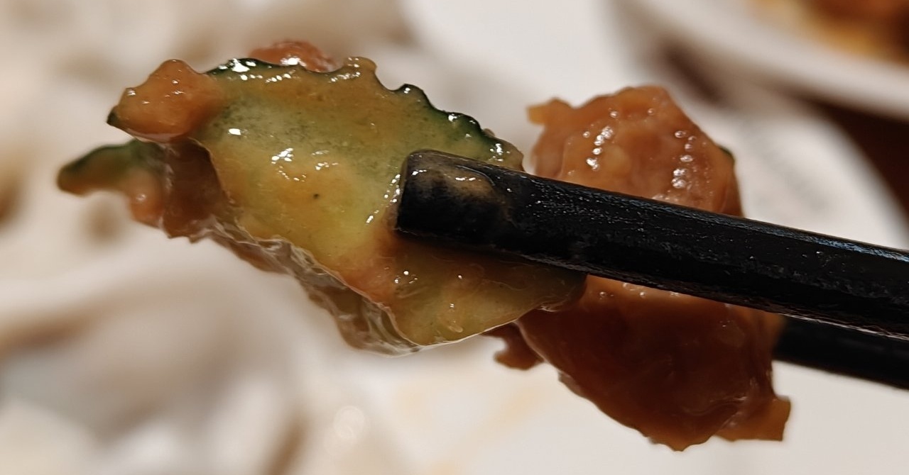 凉菜黄瓜拌油条则是来自盒友@玩家44928858 的推荐,确实很好吃,麻酱和蒜的味道非常浓郁,入口先是麻酱的口感和香气,加上蒜的辣味,然后是小酸甜带咸的底口,最后的回味则是少量芥末带来的有点冲的辛辣感,各种调料的比例特别合适,融合得很好。