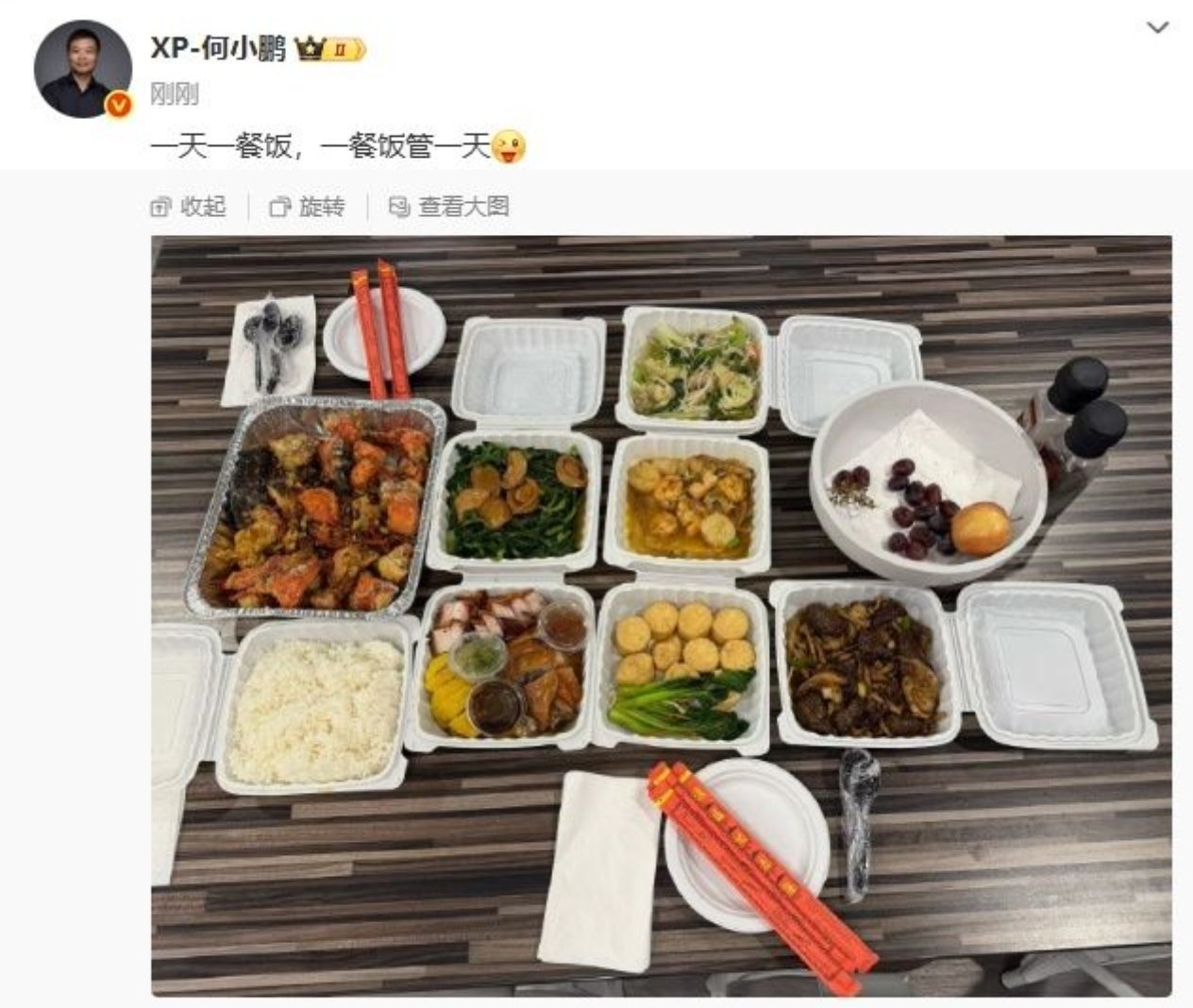 小鹏汽车董事长何小鹏日前在社交媒体晒出一桌丰盛饭菜,配文称“一天一餐饭,一餐饭管一天”,这一言论迅速引发网友热议。