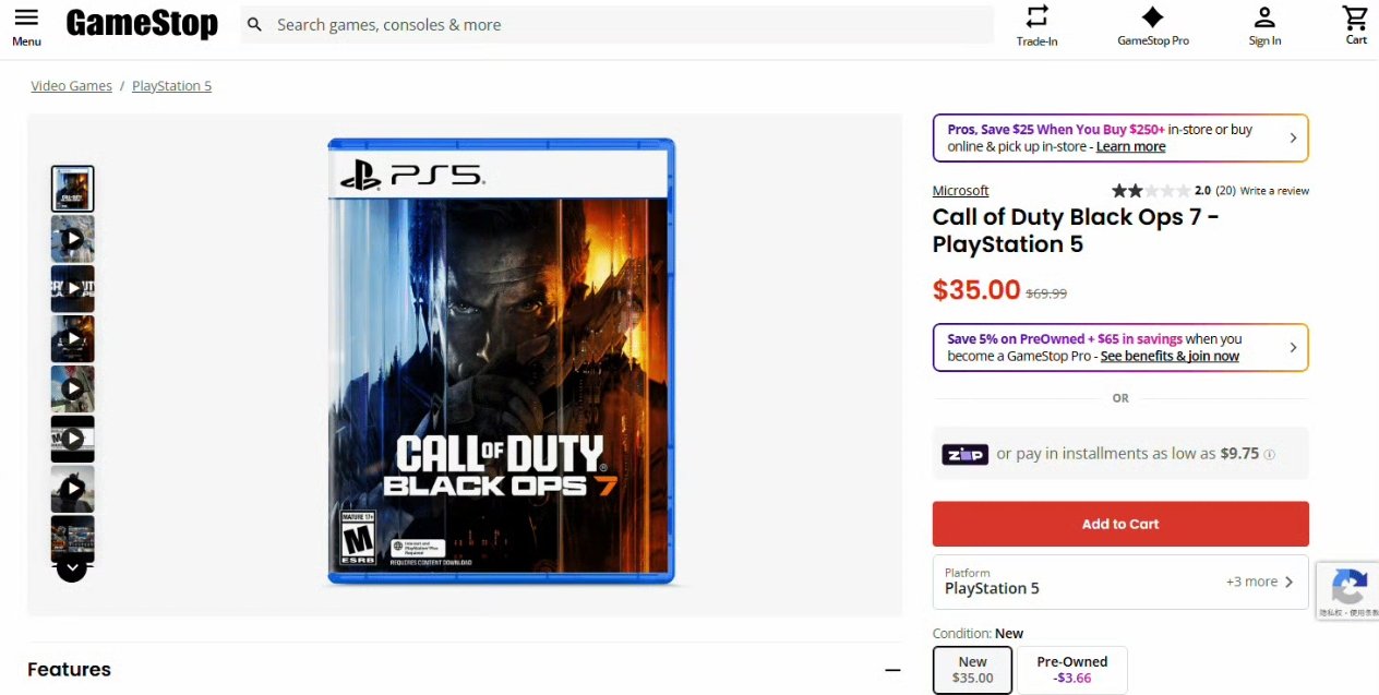 《使命召唤22:黑色行动7》发售仅一个月,就在美国游戏零售平台GameStop遭遇半价促销。原价69.99美元的实体版现在仅售35美元,涵盖PS5、PS4和Xbox Series三个平台版本。
