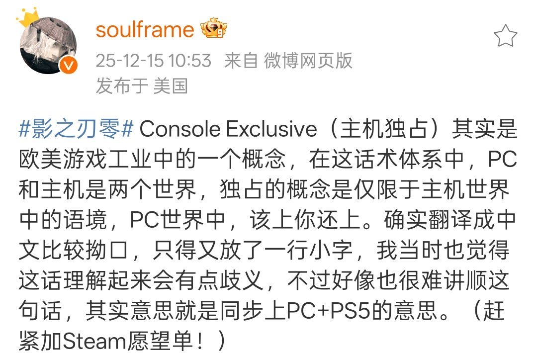 Console Exclusive(主机独占)其实是欧美游戏工业中的一个概念,在这话术体系中,PC和主机是两个世界,独占的概念是仅限于主机世界中的语境,PC世界中,该上你还上。确实翻译成中文比较拗口,只得又放了一行小字,我当时也觉得这话理解起来会有点歧义,不过好像也很难讲顺这句话,其实意思就是同步上PC+PS5的意思。(赶紧加Steam愿望单!)