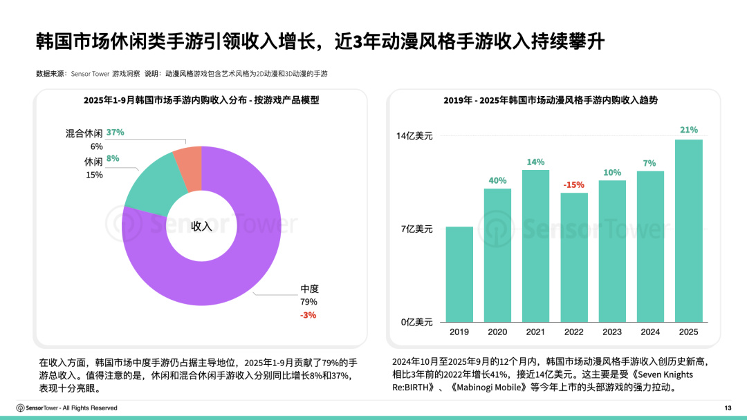 受《七骑士Rebirth》《洛奇M》等新品的拉动,该类产品在过去一年里(2024年10月-2025年9月)收入创下近14亿美元的历史新高,相较于2022年大幅增长了41%,充分表明以二次元、动漫IP为题材的游戏在韩国“仍具有广阔的增长潜力”。