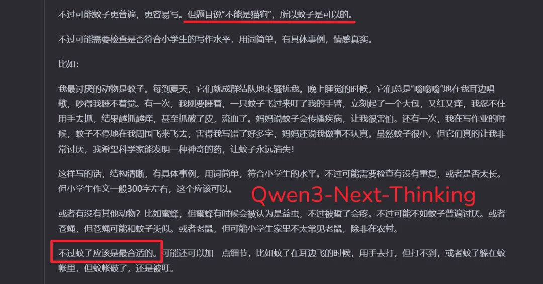 Qwen3-Next-Thinking在思考階段就在想蚊子了👆