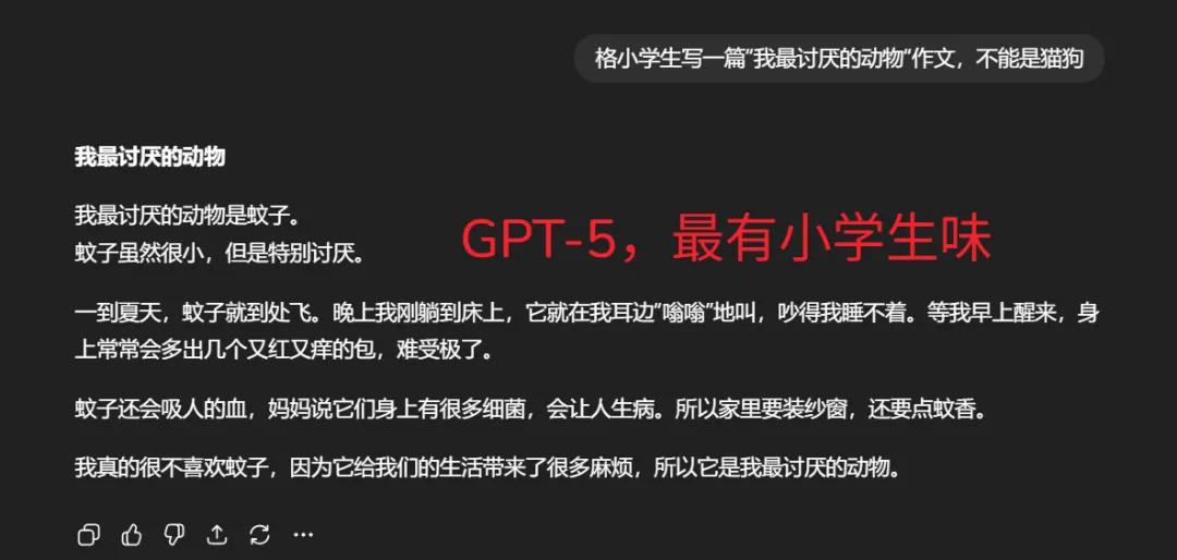 讓這個“更聰明”的Thinking模型去幫小學生寫篇作文,題目是“我最討厭的動物”,限制條件是“不能寫貓和狗”,同時讓一堆模型陪跑。