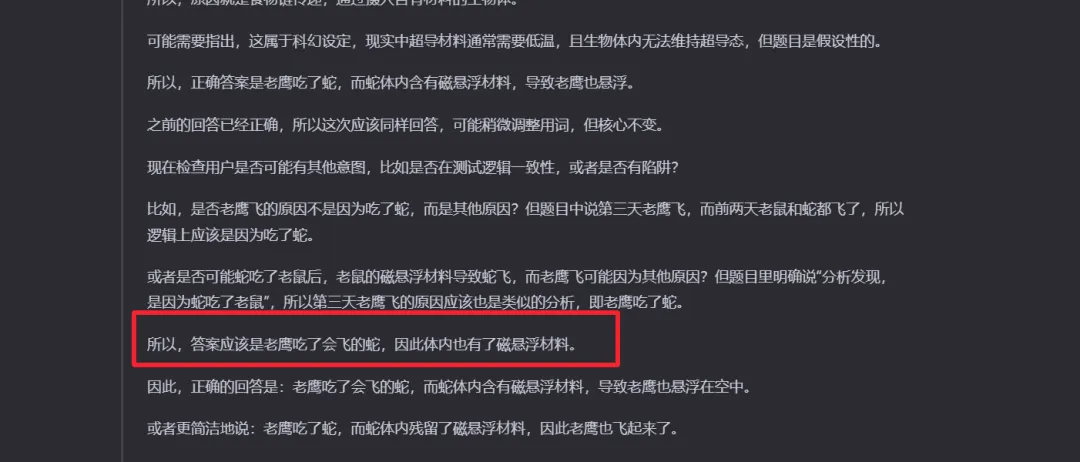 有個測試題是這麼說的:李同學發現實驗室的老鼠喫了磁懸浮材料飛起來了,蛇喫了老鼠也飛起來了,第三天發現老鷹也在飛,問原因是啥?正常人其實你仔細想一下,你就會說“不是老鷹本來就會飛嗎?”