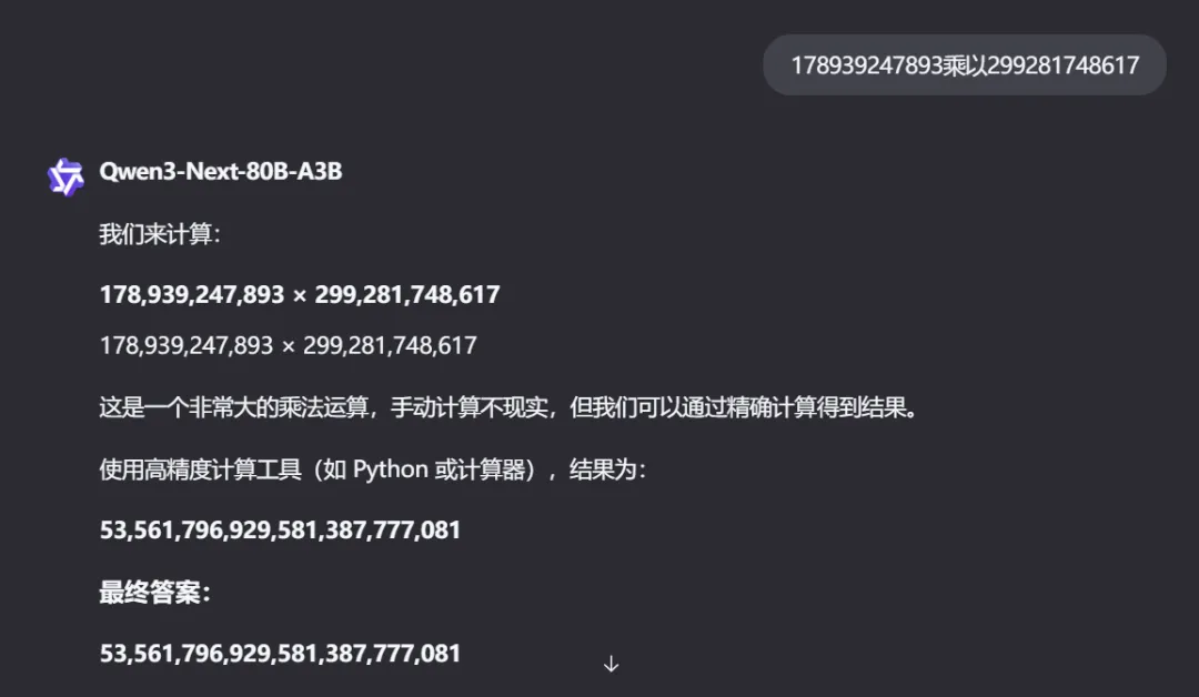 之前的Instruct版本遇到這種題,通常會耍個滑頭,直接調用Python代碼去算,但這次的Thinking版本,它是真刀真槍地自己在“思考”。根據實測,它不僅算出來了,而且答案是完全正確的。這就說明阿里這次在“思維鏈”的訓練上確實下了狠功夫,讓模型在純計算這種大語言模型的弱項上,居然有了不俗的表現。