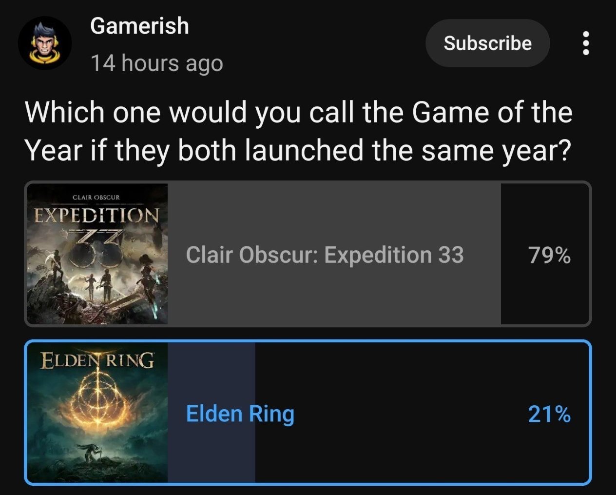 有网友发起了一项假设性投票:若《光与影:33号远征队》与2022年的年度游戏《艾尔登法环》同台竞技,结果会如何?在1.3万名玩家参与的投票中,《光与影》以79%的支持率大幅领先。这场投票将本已白热化的“关公战秦琼”讨论推向高潮。有玩家评论指出,《光与影》在叙事深度、艺术风格融合方面的创新,确实代表了当前游戏发展的新方向。回顾TGA历年获奖作品,从《巫师3:狂猎》的开放世界到《艾尔登法环》的魂类集大成,每一款年度游戏都在各自时代树立了标杆。而《光与影:33号远征队》的胜利,也被视为中小体量游戏凭借创意与精准执行战胜传统3A大作的标志。