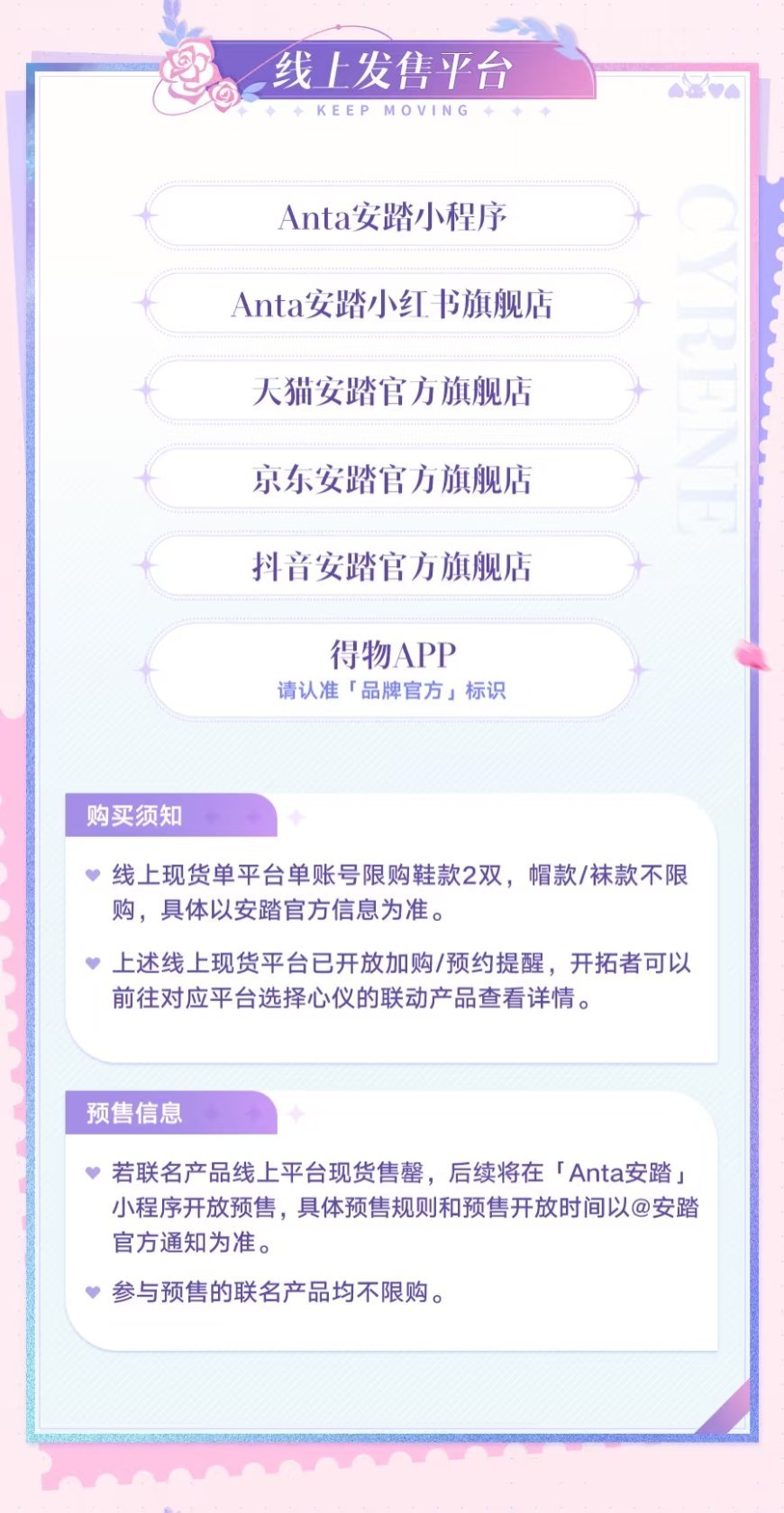 若联名产品线上平台现货售罄,后续将在「Anta安踏」小程序开放预售,具体预售规则和预售开放时间以@Anta安踏 官方通知为准。参与预售的联名产品均不限购。