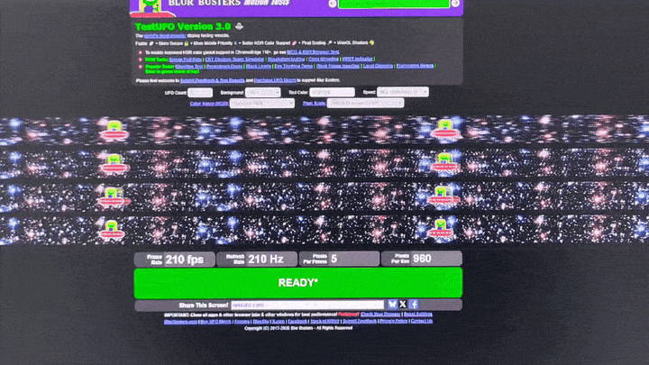 這裏可以使用「UFOTest」檢測畫面是否有撕裂、拖影,並且查看實際運行刷新率。在後續使用中也要多留意異常,若出現偶爾閃爍,建議再回調2-3Hz,優先保證穩定性而非極限幀率。