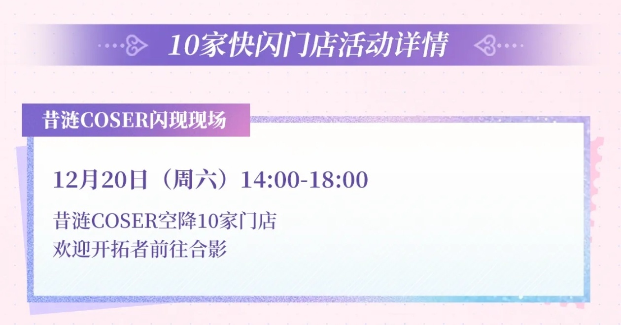 完成现场打卡即可领取「定制角色明信片」和「定制角色海报」1份。225家普通门店: