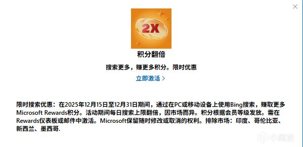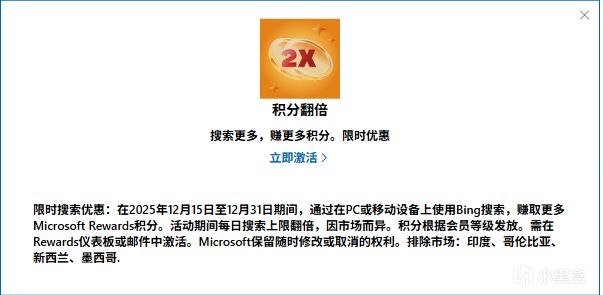 限時搜索優惠:在2025年12月15日至12月31日期間,通過在PC或移動設備上使用Bing搜索,賺取更多Microsoft Rewards積分。活動期間每日搜索上限翻倍,因市場而異。積分根據會員等級發放。需在Rewards儀表板或郵件中激活。Microsoft保留隨時修改或取消的權利。排除市場:印度、哥倫比亞、新西蘭、墨西哥.
