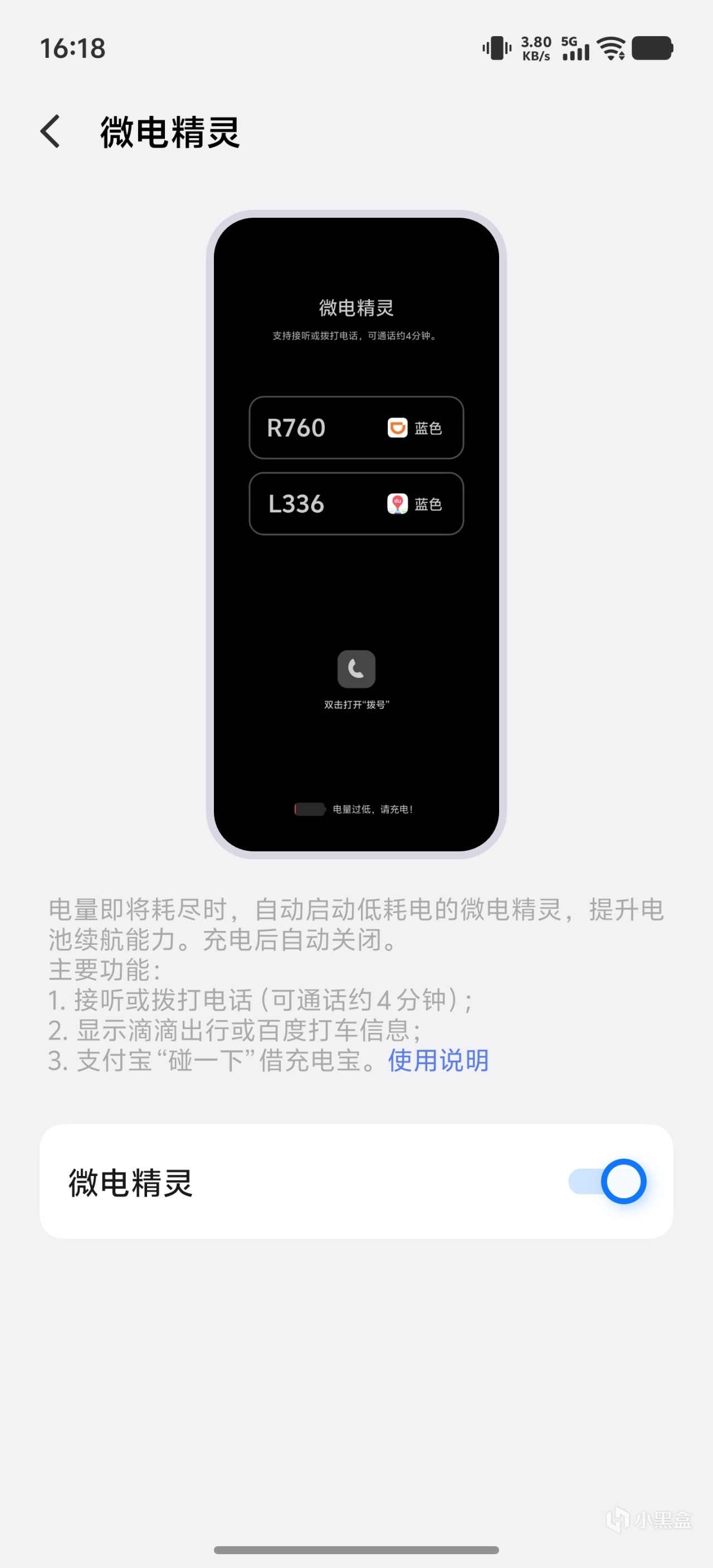 电量即将耗尽时,自动启动低耗电的微电精灵,提升电池续航能力